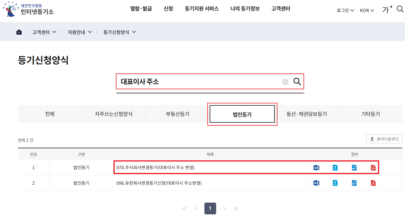 ② 법인등기 → "대표이사 주소" 검색 → "070.주식회사변경등기(대표이사 주소 변경)" 파일 다운로드