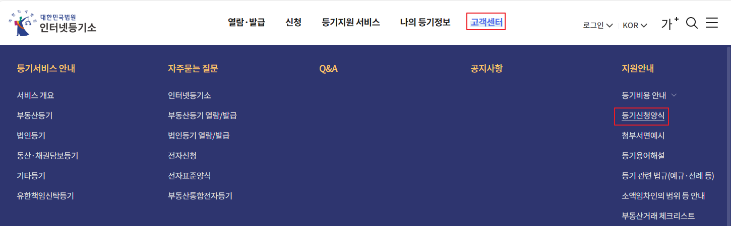 ① 인터넷 등기소 → 고객센터 → 등기신청양식