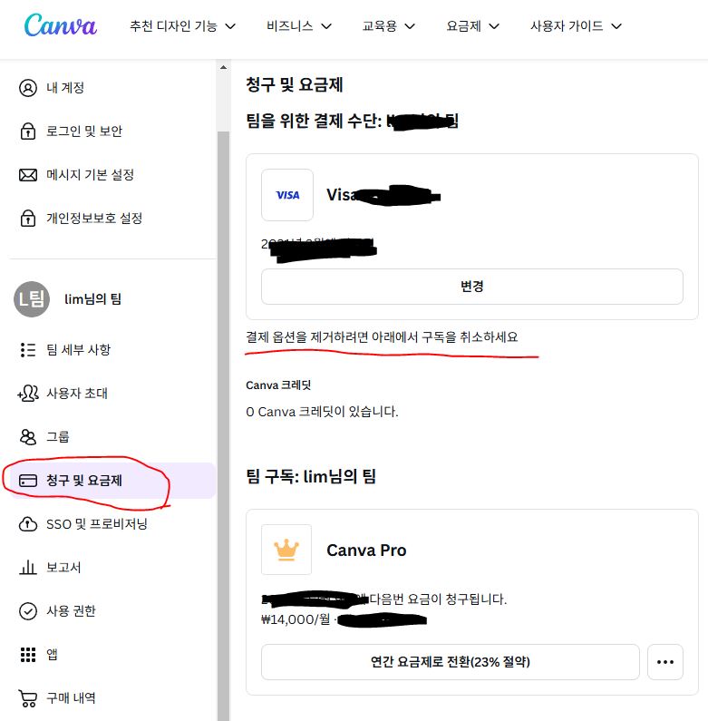 간편한 팁으로 [설정]-[청구 및 요금제]-팀구독의 점세개(추가작업)을 선택하면 "해지"를 찾을 수 있습니다.