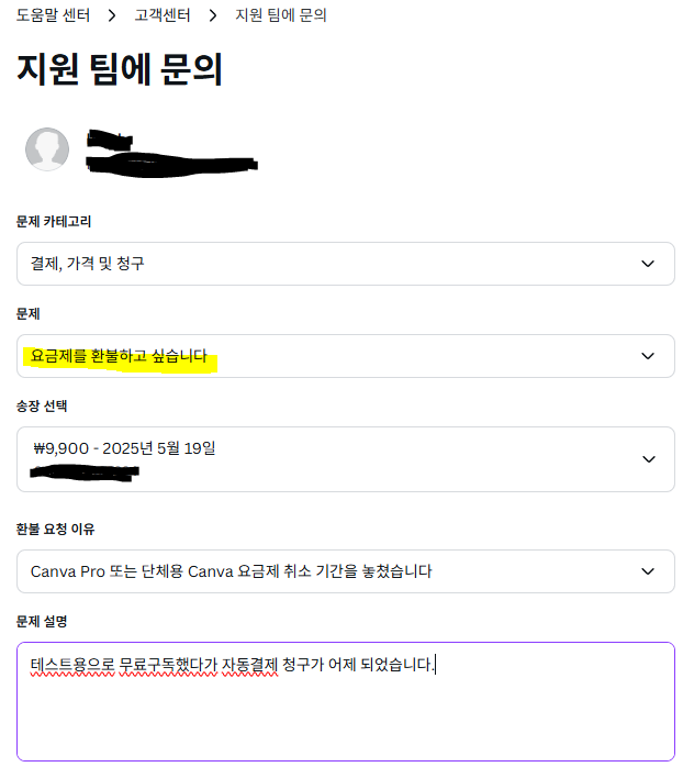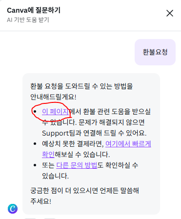 3. Canva에 질문하기 내용입력 : 환불요청 입력 → 이 페이지 선택