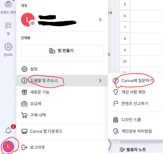 2. 프로필 클릭 → 도움말 및 리소스 → Canva에 질문하기